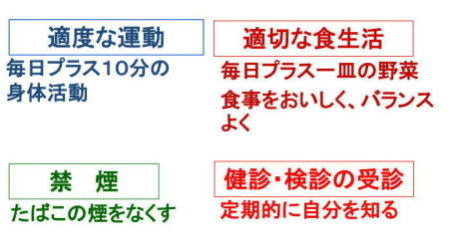日頃から活発な身体活動を心がける。(提言P42)現状より1日10分でも多く体を動かす。 身体活動レベルの高い人では、がん、循環器病、糖尿病のリスクが低下します。 日頃から活発な身体活動を行っている人はうつ病を発症するリスクが低下します。この関連は成人でも子どもでも妊婦でも見られます。 身体活動の増進は認知機能低下の抑制と認知症リスクの低減に寄与します。 高齢期に運動を行うことにより、筋力維持・増強だけでなく身体機能の向上や転倒リスクの軽減につながります。 身体活動量が多い妊婦では妊娠合併症および早産のリスクが低下し、自然分娩をできる可能性が高くなります。 小児期からの積極的な身体活動が推奨されています。 活動的な生活(国民一人一人の目標)を日頃から心がけ、実行することが大切です。 6章 心理社会的要因 心理社会的ストレスを回避する。(提言P46) ストレス要因となるライフイベントによりうつ病のリスクが増加します。 ストレスにより、虚血性心疾患やメタボリックシンドロームのリスクが増加します。 幼少期の逆境体験により、成人後の様々な疾病や不健康な生活習慣のリスクが増加します。 社会関係を保つ。(提言P47) 社会関係を保つことにより総死亡リスクは低下します。 社会関係を保つことにより循環器病や糖尿病リスクが低下します。 社会関係を保つことにより要介護認定を受けるリスクや認知機能が低下するリスクが軽減します。 睡眠時間を確保し睡眠の質を向上する。(提言P48) 適度な睡眠時間をとることにより、循環器病、高血圧、糖尿病の予防につながります。 7章 感染症 肝炎ウイルスやピロリ菌の感染検査を受ける。(提言P52) 肝炎ウイルス感染は肝がんの最大のリスク要因です。 ピロリ菌は日本人の胃がんの最大のリスク要因です。 ヒトパピローマウイルスは子宮頸がんの最大のリスク要因です。 成人T細胞白血病/リンパ腫はHTLV-1というウイルス感染が原因で発症する白血病です。 インフルエンザ、肺炎球菌、帯状疱疹を予防する。(提言P54) 高齢者では、インフルエンザ、肺炎球菌、帯状疱疹のワクチン接種により、予防が期待されます。 8章 健診・検診の受診と口腔ケア |